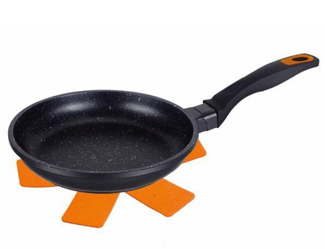 - EASY TO CLEAN! SAVE 35% ENERGY ECO FRIENDLY PFOA, LEAD, CADIUM FREE Material: Cast aluminum Frypan: 20x3,9 cm Color: black/orange BONUS PROTECTOR