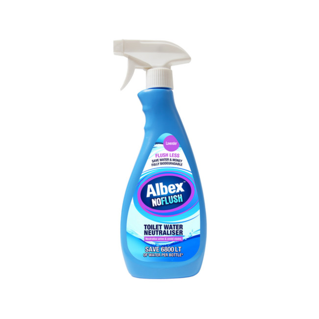 Albex Noflush is a 100% environmentally friendly and biodegradable toilet water neutraliser made from multi-stain bacillus spores, a blend of 6 specific enzymes and plant-based surfactants. Just one spray of Albex Noflush in the toilet bowl will put urine to sleep by neutralising the urine and leaving behind a fresh scent and blue colour. You can save 6800LT of clean water with every 500ml bottle of Albex Noflush. One bottle has an 860 spray capacity, giving you 860 uses before having to replace the bottle. Albex Noflush has the added benefit of cleaning the toilet bowl as the enzymes in the formulation actively break down the uric acid. This prevents a yellow ring of urine from developing in the toilet bowl when the consumer does eventually flush. Buy Albex Noflush and start saving water, saving money and protecting the environment. What's in the box 7 x 500ml Albex Noflush Lavender Toilet Water Neutraliser