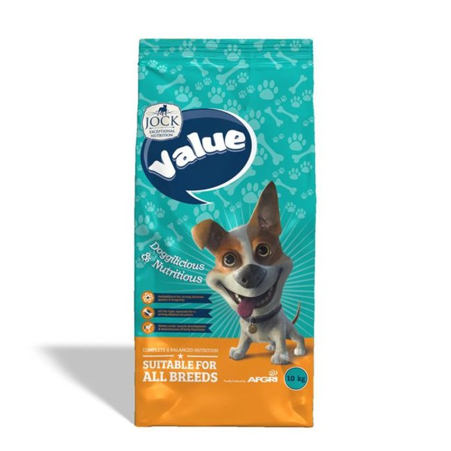 Jock Value: Complete and Balanced nutrition suited for all dog breeds: The role that nutrition plays in keeping your dog healthy is absolutely critical. Jock Value is specially formulated to completely address these needs and keep your pooch a few steps ahead of the rest. The secret lies in our protein-rich formulation, which is loaded with the 10 essential amino acids. These key nutrients are vital for your dog's health and help maintain and build muscle strength. Jock Value is also a rich source of antioxidants, thanks to added vitamin C and E. These powerful elements, along with a combination of essential minerals, help limit the damaging effects of free radicals in your dog's body and help support overall health. Add to this our carefully selected premium ingredients and you have a dog food that is as delicious as it is nutritionally sound. Ingredients: Cereals, Derivatives of vegetable origin, Meat & Animal Derivatives, Vegetable Protein Extracts, Fats & Oils, Minerals, Vitamins and Approved Antioxidants, Contains at least 5% Genetically Modified Organisms, Nutritional Information: Nutritional information: