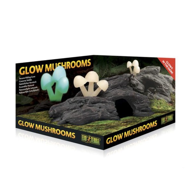 - Glow Mushrooms The Exo Terra Glow Mushrooms add an exciting accent to any terrarium, during the day as well as at night. In nature decaying wood is regularly used by reptiles, amphibians and invertebrates to hide, sleep or lay their eggs. Bioluminescent mushrooms often grow on these decaying wood logs. Just as in nature, the Exo Terra Glow Mushrooms seem to grow on a decaying wood piece. The Exo Terra Glow Mushrooms absorb light during the day, and slowly release it during the night. The glow of the mushrooms creates a dim light in the terrarium, allowing crepuscular and nocturnal animals to see properly at night. The Exo Terra Glow Mushrooms offer a safe spot to hide and sleep, while the moist microclimate will support thermo-regulation, hydration, and aid the natural shedding process of reptiles. What's in the box: x 1 Glow Mushrooms Features: