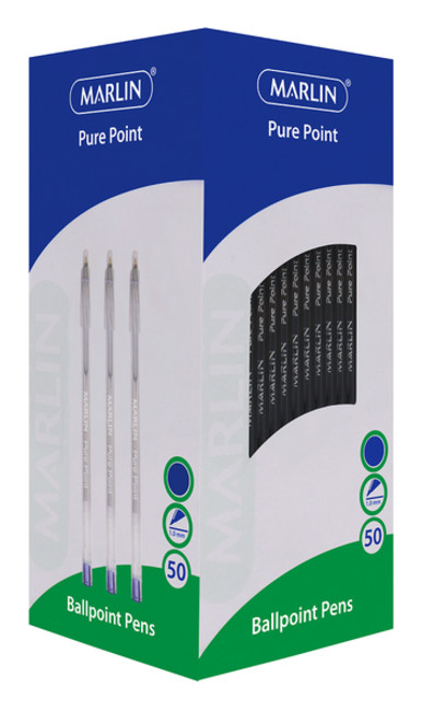 - Box of 50 What's in the box 1 x Marlin Pure Point Medium Transparent Ballpoint Pens