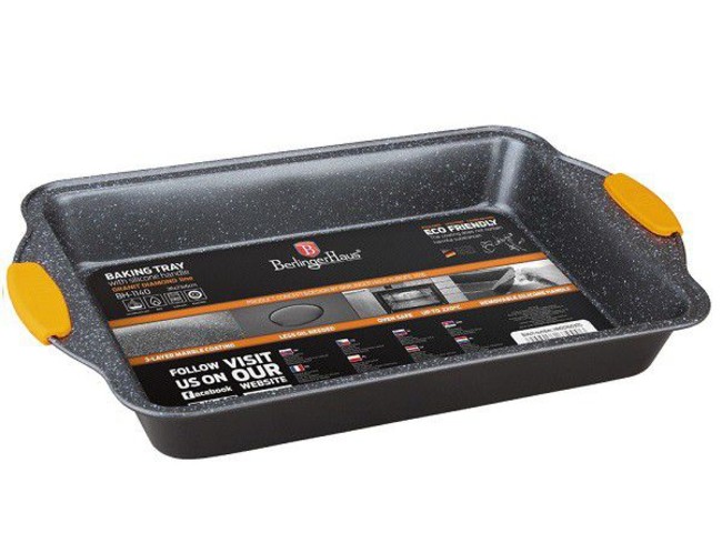 Enjoy healthy cooking without the use of oils while you find clean up a breeze. The extremely durable keravis triple non-stick Marble coating is free of PFOA, Nickel and heavy metals. Berlinger Haus is being introduced to the north American market in fall of 2015, we are certain you will love your Berlinger Haus cookware for many years while you enjoy a piece of Hungary. The difference with our Baking pans? An intelligently designed baking pan set with 3-Layer Marble non-stick coating, commercial grade quality and wide rounded ends for easy handling Your search for the best Baking pans is over 100% satisfaction guarantee 3-Layer Marble non-stick coating with easy release technology so you can bake like a professional Heavy duty Carbon steel to prevent rust and warping and last a lifetime Intelligent design with silicone handles and rounded ends to make handling and grabbing easy Oven safe up to 220 degrees What separates us from the competition is our superior 3-Layer Marble non-stick coating and silicone handles with round ends When you purchase an Elite Granit Diamond Line Bakeware Baking Pans Set, you will immediately notice the highest quality bakeware along with an intelligent design3 Layer Marble Coating Features: