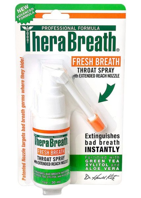 - Therabreath Throat spray is the ideal product to combat bad breath that emanates from the back of the throat or tonsils by delivering a powerful dose of Therabreath active ingredients right at the source of the problem to neutralise sulphur production