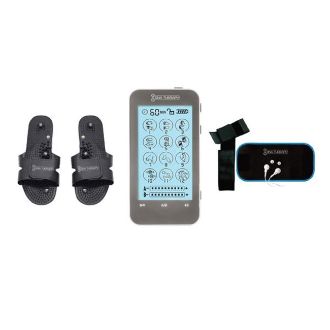 Premium Collection i12 Massager & accessories What's in the box 1x i12 Massager 1x Physiotherapy belt 1x Reflexology slippers 2x Set of large single sided adhesive electrode pads 2x Electrode wire with 2 leads 1x Instruction user manual 1x USB extension wire 1x AC/DC adapter 1x Application acupuncture points chart 1x Pad holder