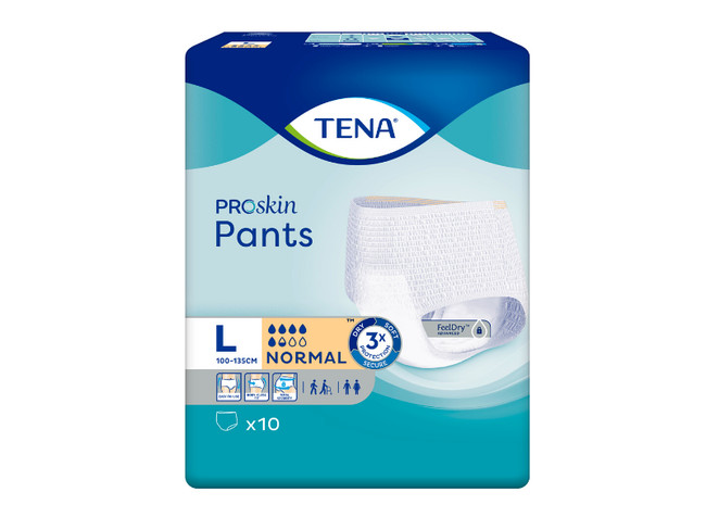 Suitable for medium to heavy bladder leakage. TENA Pants Normal provide a discreet fit and reliable protection. TENA ProSkin Pants have been equipped with the latest moisture-reducing technologies, ensuring dryness, leakage protection and odour control. Feel Dry Advanced technology quickly pulls the liquid away from the skin, while the absorbent body quickly holds even large amounts of urine inside the product away from the skin, helping to maintain its health. These disposable incontinence absorbent pants are made of breathable and extremely absorbent fabric-like materials. Fits hips: 100 to 135cm What's in the box 1 x Box with 4 Packs of 10 (40) TENA Proskin Pants Normal Large
