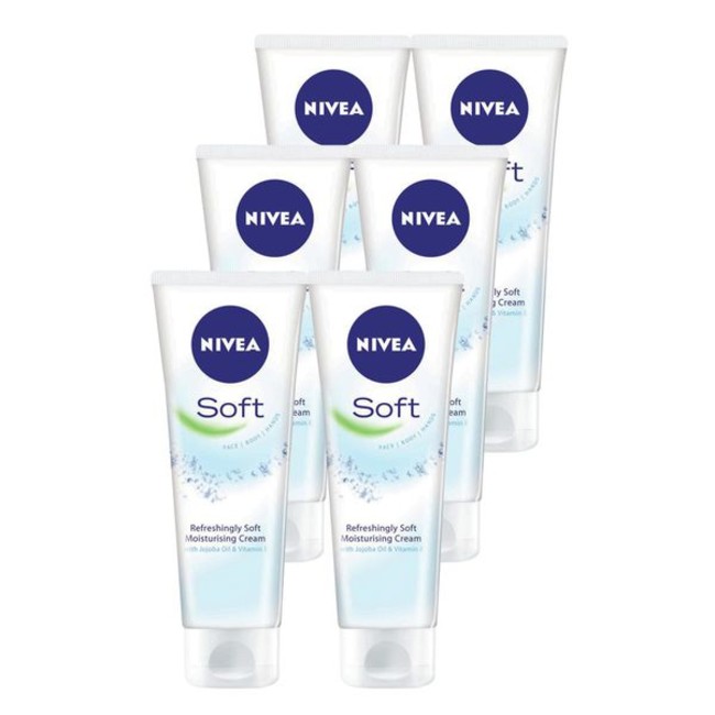 NIVEA Soft is a highly effective, intensive moisturising cream for everyday use. The light formula with Vitamin E & Jojoba Oil is quickly absorbed and refreshes the skin. Enjoy the invigorating feeling that leaves your skin soft and supple. Skin compatibility dermatologically approved. What's in the box 6 x 75ml