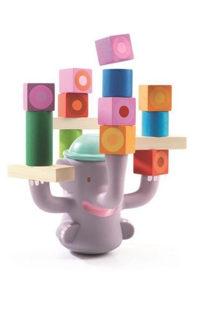 A balancing game by Djeco. - Take turns to stack the wooden blocks onto the elephant starting with the head but be careful, he may topple over at any time - Age 2+ years - Wood. Non toxic, water based stain - Box size: 17cm x 24.6cm x 14cm What's in the box 1 x Elephant, 20 x Wooden Pieces