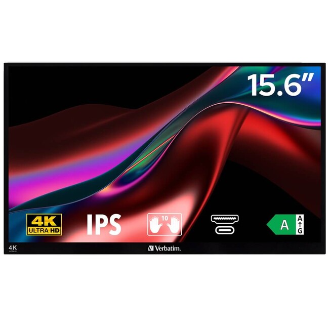 Product Information Verbatim 15.6" 4K UHD Portable Touchscreen Monitor (32238) - Resolution: 3840 x 2160 IPS, Contrast Ratio: 1000:1, Response Time: 6ms (GTG), Aspect Ratio: 16:9, Brightness: 350nits, FreeSync, Connectivity: 2 x USB-C, 1 x HDMI 1.4,1 x USB-A 2.0, 3.5 mm Audio jack, Built-in kickstand, Tilt: from 0° up to 85°