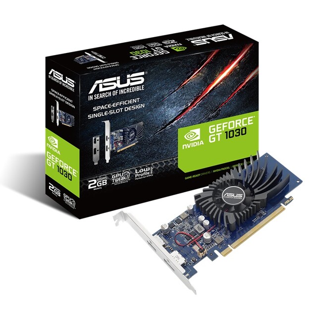 ASUS GeForce GT 1030 2GB GDDR5 Low Profile Graphics Card (GT1030-2G-BRK) - Bus Standard: PCI Express 3.0, Engine Clock: OC Mode - GPU Boost Clock: 1506MHz, GPU Base Clock: 1266MHz, Gaming Mode (Default) - GPU Boost Clock: 1468MHz, GPU Base Clock: 1228MHz, CUDA Core: 384, Memory Speed: 6008MHz, OpenGL: OpenGL 4.5, Memory Interface: 64-bit, Digital Max Resolution: 7680 x 4320, Maximum Display Support: 2, Interface: 1 x HDMI 2.0b, 1 x DisplayPort 1.4, Recommended PSU: 300W, Slot: 2 Slot