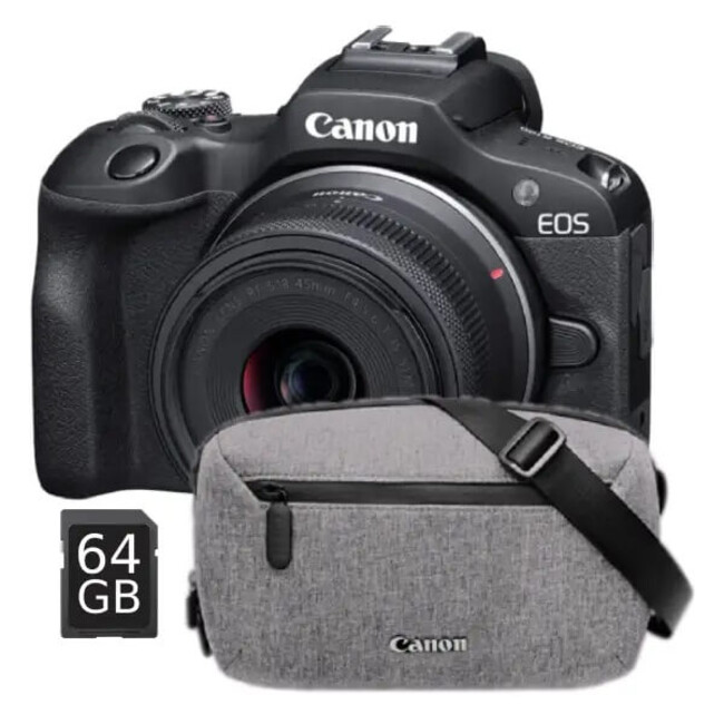 Canon EOS R100 Mirrorless Camera Travel Kit (6052C095AA) - Image Sensor Type: 22.3 x 14.9mm CMOS, Total Pixels: 25.8 megapixels, Image Processing Type: DIGIC 8, ISO Sensitivity: ISO 100-12800 in 1/3 or 1-stop increments, Shutter Speed: 30 - 1/4000 sec (1/3 stop increments), Screen: 7.5 cm (3.0") LCD (TFT) Display, Built-in Flash, Includes Canon RF-S 18-45mm f/4.5-6.3 IS STM Lens, 64GB SD Card and Camera Carry Case