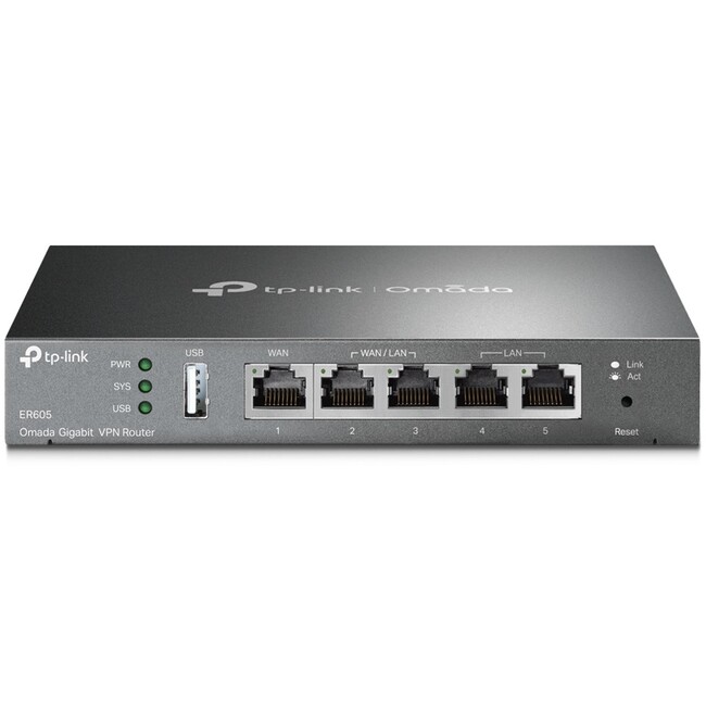 TP-LINK ER605 Omada Gigabit VPN Router (TP-ER605) - Interface: 1 x Fixed Gigabit WAN Port, 2 x Fixed Gigabit LAN, 2 x Changeable Gigabit WAN/LAN, 1 x USB 2.0 Port (Connecting 4G/3G Modem as WAN Backup), Flash: 128 MB NAND, DRAM: 256 MB DDR, Power Supply: External 12V/1A DC Adapter